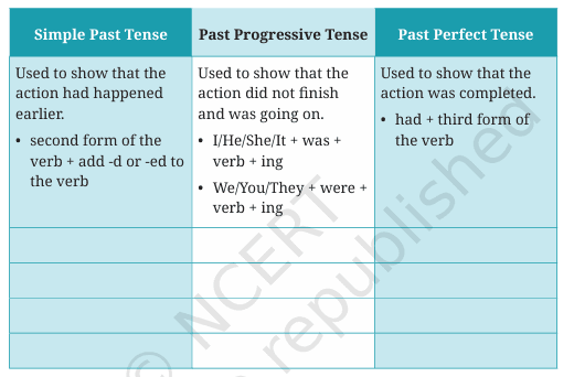 | Simple Past Tense | Past Progressive Tense | Past Perfect Tense |
