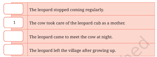 The leopard is a wild animal but it became a friend of a cow. When the leopard grew up, it left the village. It came in the night to meet the cow. The leopard would sit beside the cow. They also played together. Villagers were surprised at their friendship.