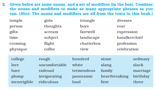 2. Given below are some nouns, and a set of modifiers (in the box). Combine the nouns and modifiers to make as many appropriate phrases as you can. (Hint: The nouns and modifiers are all from the texts in this book.)