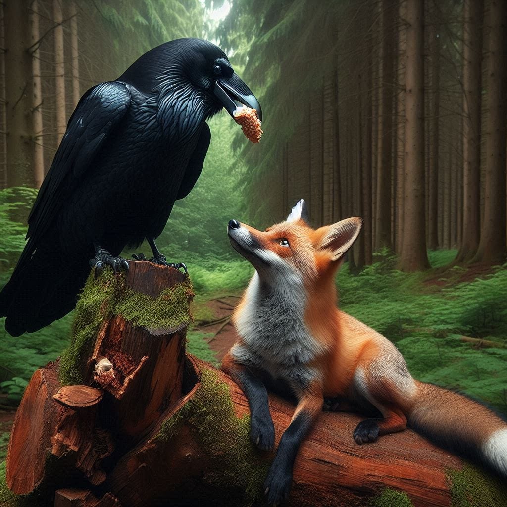 Reynard (laughing): Ah-ha! Thank you, Sir Raven, for such a generous gift! You see, pride, my friend, can sometimes make one act quite foolishly. Now, if you’ll excuse me, I’ll enjoy this meal.