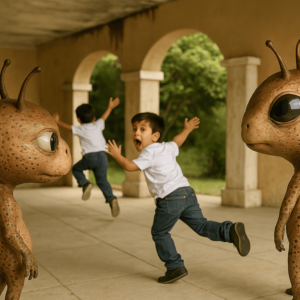 One sunny morning, our school was busy as usual. Suddenly, everyone started shouting and running towards the playground. Curious, I rushed outside to see what was happening. To my surprise, I saw two big aliens standing near the school gate! They looked just like giant ants, with long feelers and sparkling eyes.